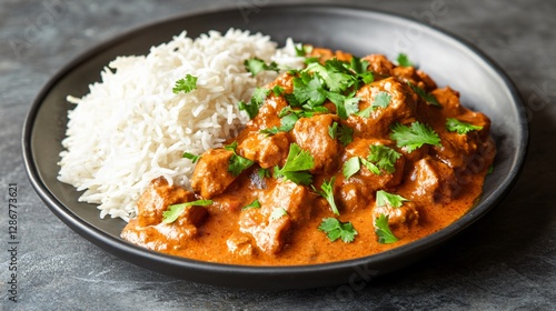 A visually stunning gourmet tikka masala, plated in geometric patterns with a balance of colors and textures on a matte black dish