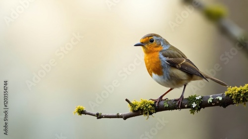A Vivid European Robin Perched on a Mossy Branch, a Delicate Spring Scene