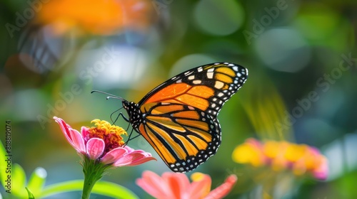 A vivid image of a Monarch butterfly with its wings spread, perched delicately on a blooming pink and yellow flower, with soft-focus background