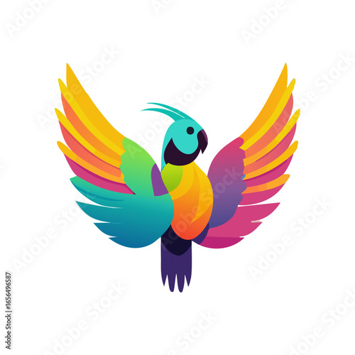 A vividly colored parrot displays its stunning wings, showcasing a range of bright hues. The parrot's lively pose captures its playful nature and beauty in an artistic style.