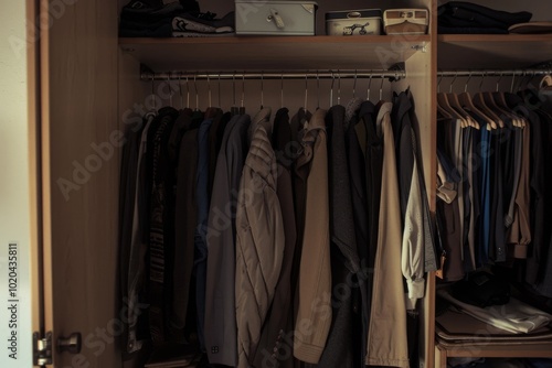 A wardrobe filled with various jackets, sweaters, and shirts, hinting at personal style and diverse fashion choices.