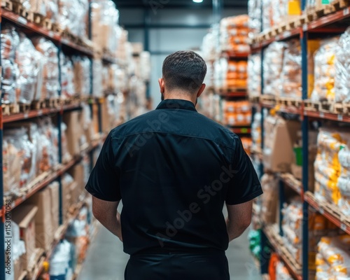 A warehouse worker navigates through shelves stocked with goods, showcasing the efficiency of modern logistics and storage.