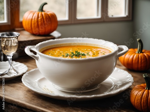 pumpkin, table, warm, cosy, autumn, bounty, food, delicious, comfort, meal, lunch, dinner, vegetable, healthy, nourishing, tasty, appetising, homemade, receipe, kitchen, dining, tablecloth, harvest, season, seasonal, fall, orange, gourd, natural, organic, ingredient, steam, hot, bowl, spoon, ceramic, wood, rustic, traditional, garnish, herb, spice, autumn, festive, celebration, holiday, thanksgiving, halloween