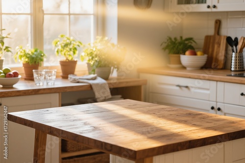A warm and cozy kitchen bathed in bright sunlight, featuring a charming wooden table and thriving potted herbs
