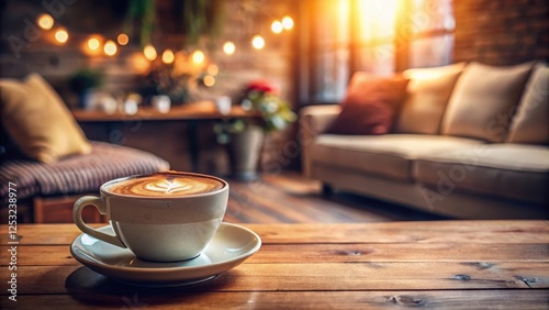 A warm and inviting cup of cappuccino coffee on a wooden table with a blurred background of a cozy living room , cappuccino, morning drink