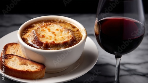 A warm bowl of classic French onion soup served with toasted bread and a glass of rich red wine. The meal showcases comfort food in an elegant style. Perfect for cozy dinners. AI