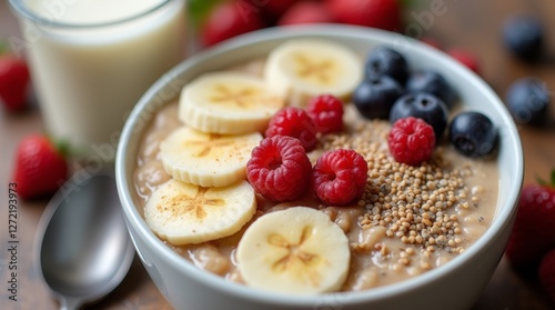 A warm bowl of oatmeal topped with a medley of fresh berries