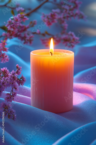 A warm, glowing candle, symbolizing inner peace and happiness, isolated on a pastel background,