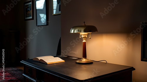 A warm, inviting workspace featuring a vintage brass desk lamp illuminating an open book on a dark wooden table, surrounded by framed pictures reflecting a cozy atmosphere.