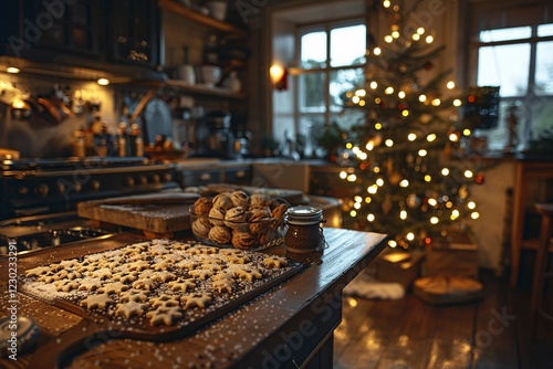 A warm kitchen setting features freshly baked cookies on a wooden table, with a decorated Christmas tree softly lit in the background. The atmosphere radiates holiday cheer
