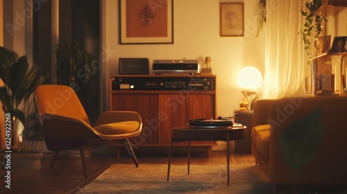 modern, living, room, vintage, furniture, cosy, warm, interior, design, record, player, chair, lighting, lamp, shelf, art, print, artwork, plant, curtain, wooden, cabinet, speaker, audio, system, decor, retro, style, home, house, apartment, indoor, table, carpet, atmosphere, mellow, relaxed, elegant