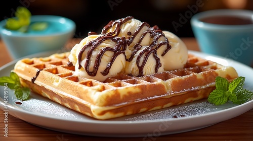 warm, waffle, vanilla, ice, cream, chocolate, drizzle, few, fresh, mint, leaf, white, plate