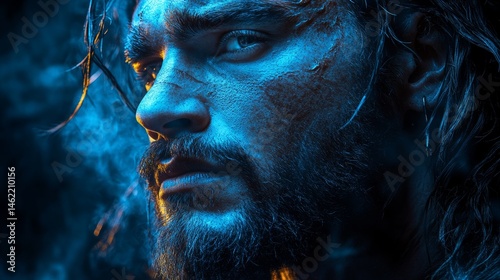 warrior, gaze, blue, intensity, strength, determination, dramatic, portrait, expression, man, character, emotion, lighting, heroic, battle, mystery, atmosphere, power, depth, narrative, shadow, sharpened, artistry, cinematography, visual, storytelling, raw, courage, cinematic, suspense, bravery, intrigue, face, fantasy, exploration, conflict, scene, allure, detail