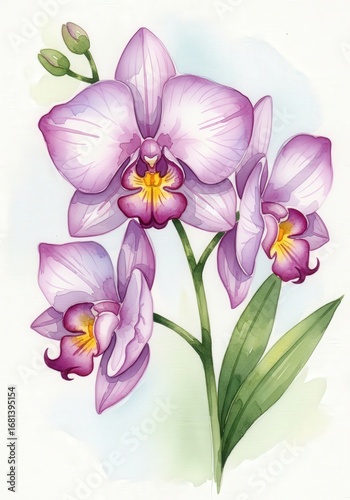 floral, orchid, bloom, purple, delicate, beauty, watercolor, botanical, plant, illustration, stem, blossom, flower petals, colours, vibrant, nature, art, elegant, leaf, growth, closeup, detail, spring, flora, exotic, tropical, fragrance, tender, fresh, arrangement, unique, aesthetic, graceful, soft, light, bright, visual, gentle, design, studio, artistic, structure, closeup, pattern, composition, style, image