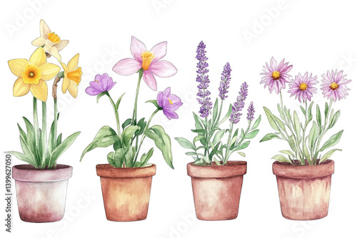 a watercolor illustration featuring four different potted flowers showcasing vibrant blooms like daffodils orchids lavender and daisies emphasizing nature's beauty and gardening