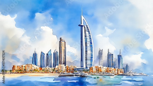 watercolor, illustration, emirate, tower, dubai, emirate, skyline, city, building, city landscape, architecture, skyscraper, panorama, urban, sky, water, building, downtown, toronto, travel, new york city, manhattan, view, us, chicago, river, business, bay, landmark, harbor