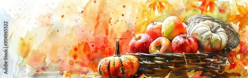 A watercolor painting depicts a basket overflowing with apples and pumpkins, surrounded by vibrant autumn leaves. The background is a soft, abstract wash of orange, yellow, and pink, suggesting a sunn