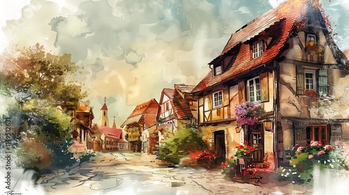 A watercolor painting of a charming, European village street with colorful buildings and flowers.