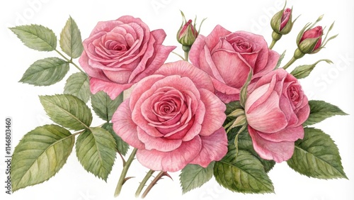 A watercolor painting of pink roses with green leaves and buds on a white background.