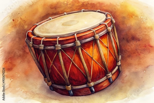 drum, musical, instrument, watercolor, painting, art, traditional, culture, music, rythm, sound, percussion, brown, orange, red, wooden, skin, rope, tied, parchment, background, illustration, painted, detail, intricate, warm, tone, artist, creative, expression, heritage, heartbeat, folklore, folk, ancient, craftsmanship, artistry, craft