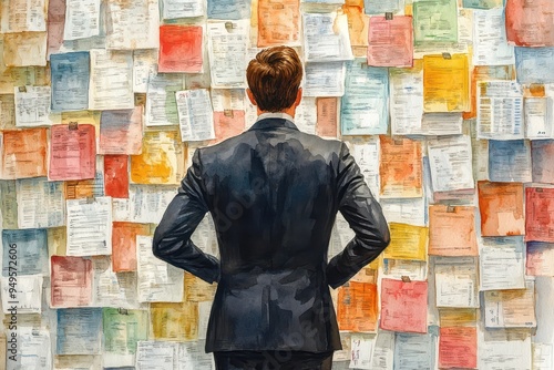 A watercolor-style digital painting depicting a man in a dark suit standing with his hands on his hips, facing a large wall covered in various documents and colorful papers,