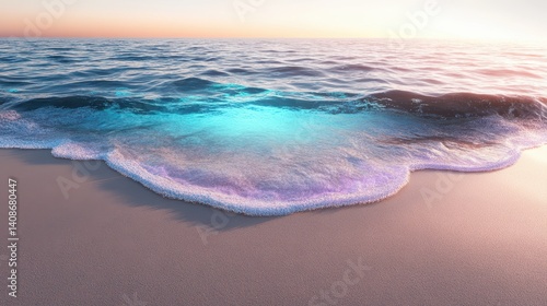 A wave approaches the sandy beach, creating a serene coastal scene.