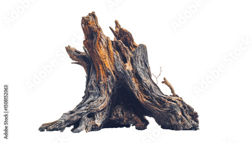A weathered, dark grey and orange wood stump, intricately textured with deep grooves and hollows, sits against a black background