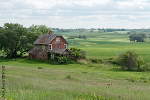 farmhouse, red barn, rural, countryside, landscape, farm, agriculture, nature, summer, sky, cloud, tree, grass, hill, rolling hills, peaceful, serene, idylli, scenic, open space, midwest, simplicity, rustic, weathered, old, traditional, green, lush, vibrant, scenic view, farmland, field, meadow, outdoors, natural beauty