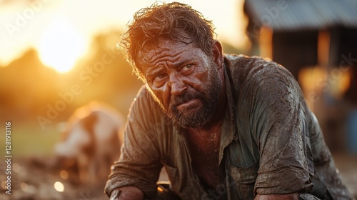 man, sunset, muddy, rural, resilience, struggle, nature, hardship, emotion, determination, perseverance, survival, dirt, farm, labor, strength, solitude, hope, warm light, earthy, gritty, rustic, humanity, work, life, portrait, landscape, season, farmer, field, dusk, evening, dramatic, sharpened, depth, mood, connection, expression, storytelling, candid