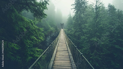 A weathered wooden suspension bridge stretching across a mist-filled ravine, surrounded by dense forest and steep, mossy rock faces.