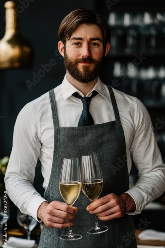A well-dressed bartender holds two glasses of sparkling wine, showcasing elegance and professionalism in a stylish bar setting.