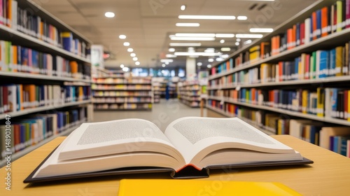 A well-lit library interior with open book.