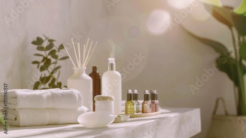 bathroom, spa, vanity, towel, skincare, cosmetic, organised, clean, contemporary, essential, natural, light, calming, hygiene, decorative, potted, plant, sunlight