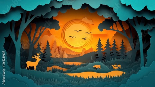 A whical paper cut-out forest scene depicts deer and other wildlife silhouetted against a vibrant sunset over rolling hills and a serene lake creating a cozy and idyllic 4K high