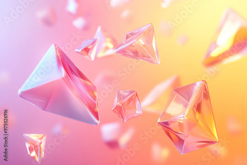 A whimsical abstract background with a gradient from soft pink to bright orange. _D geometric shapes such as floating tetrahedrons and hexahedrons are scattered playfully, with a translucent finish th