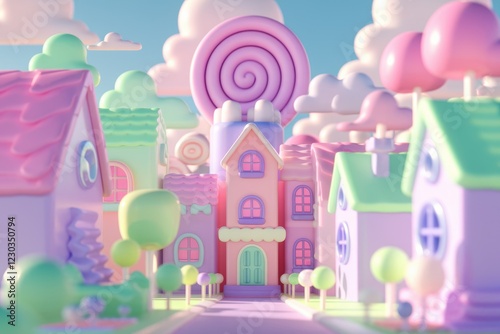 A whimsical candy-colored town with pastel houses, lollipop trees, and a giant swirl lollipop in the sky.