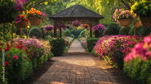 A whimsical garden path lined with flowers of different kinds, leading to a charming gazebo.