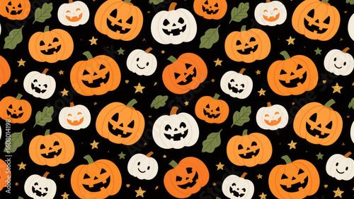 A whimsical Halloween pattern featuring a seamless arrangement of orange and white jack-o'-lanterns with cheerful, carved faces. Halloween Costumes, Halloween Background, Happy Halloween