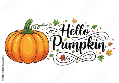 A whimsical hello pumpkin design with leaves isolated on transparent background