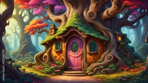 treehouse, colourful, style, design, texture, artwork, cartoon, digital artwork, fantasy art, house, forest, autumn, tree, wood, magical, enchanted, whimsical, fantasy, fairy tale, illustration, painting, vibrant, orange, red, pink, purple, green, brown, mossy, wood, nature, cosy, home, warm, peaceful, serene, happy, fall, leaf, foliage, storybook, landscape, vertical, element, background, graphic