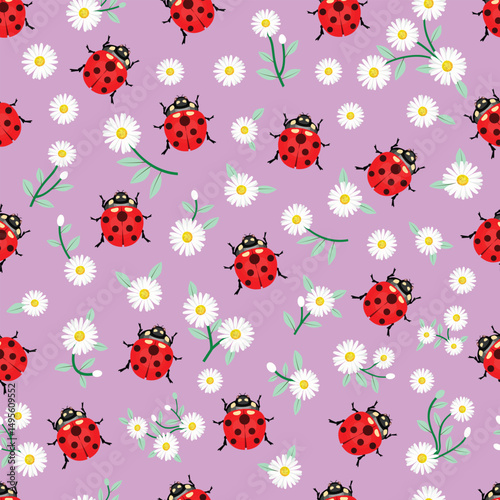 coccinellidae, flower, daisy, insect, seamless pattern, floral, daisy, bug, pattern, seamless, leaf, leaf, blossom, spring, garden, repeat, design, playful, pink, purple, background, wallpaper, botanical, fabric, decor, textile, delightful, vibrant, red, lush, green leaf, summer, children, children, charming, seasonal, craft, whimsical, vibe, nature, motif, illustration, vector, print, beetle, animal, flower