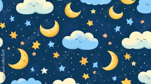 cloud, moon, star, night, sky, pattern, whimsical, cute, design, cartoon, illustration, dreamy, celestial, background, decorative, art, texture, playful, blue, yellow, smile, fantasy, nightscape, imagery, fun, creative, cosy, serene, peaceful, soft, bright, cheerful, aesthetic, vibrant, children, childcare center, bedding, fabric, wallpaper, print, artful, joyful, imaginative, childlike, enchanting, nature, graphic, night time, colourful