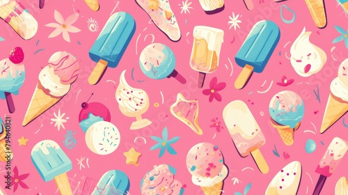A whimsical pattern featuring pink ice cream in a playful cartoon design creating a charming decorative texture