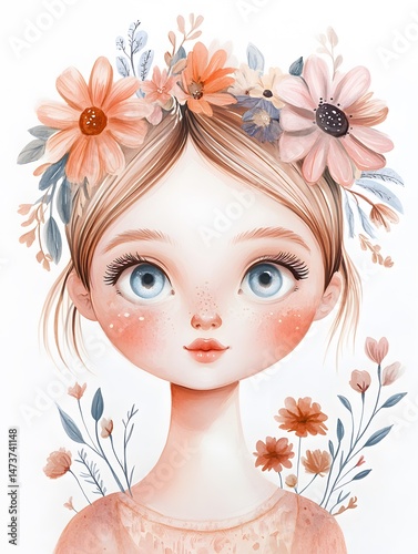portrait, girl, floral, face, flower, innocence, beauty, watercolor, crown, illustration, art, soft, gentle, charming, springtime, young, children, pretty, lovely, sweet, delicate, style, tender, adorable, fairy tale, dreamlike, romantic, whimsical, aesthetic, creative, pastel, bloom, blossoming, stem, bud, foliage, leaf, serenity, peace