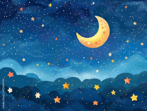 A whimsical watercolor painting of a night sky with a crescent moon and scattered stars.