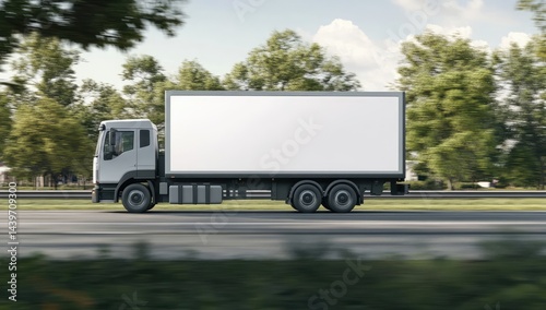 truck, box, delivery, transport, cargo, vehicle, road, transportation, shipping, logistic, freight, driving, highway, expressway, travel, journey, commercial, business, industry, automotive, conveyance, haulage, delivery truck, roadway, street, lane, route, pathway, speed, motion, motion blur, landscape, tree, sky, summer, daytime