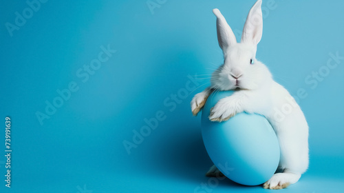 A white bunny with upright ears is hugging a large blue egg against a matching blue background. Banner Copy space for text