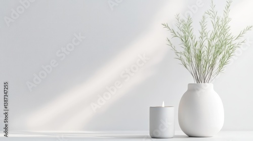 A white candle and vase with greenery sit on a surface. The vase is round and holds light green stems. The scene is minimalist, with soft lighting creating shadows. The image is high-quality, showca