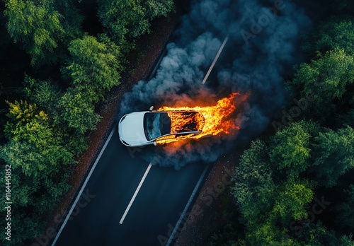 white, car, on, fire, forest, road, flames, orange, red, smoke, billowing, intense, heat, bottom, upwards, spreading, green, tree, background, asphalt, paved, straight, airborne, view, up high, environment, vehicle, accident, burning, emergency, response, nature, scenic, desolate, unoccupied, nobody, no, animal, isolated, incident, dangerous, hazard, inferno