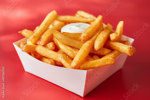 french, fries, mayo, dip, white, container, red, background, snack, food, gold, fast, delicious, crispy, bowl, junk, side, dish, tasty, vibrant, meal, comfort, closeup, top, view, photo, savoury, indulgence, time, simple, isolated, bright, classic, fried, street